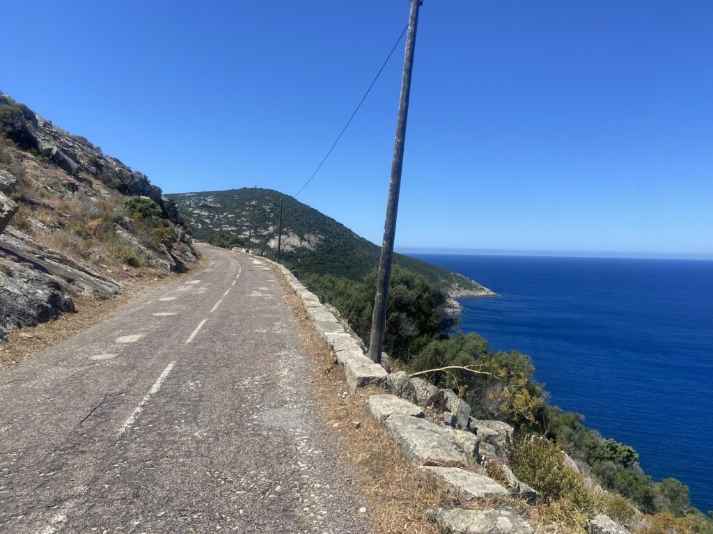 Tot vandaag, of specifiek tot de smalle kustweg die van Calvi naar Galéria voert. Daar overheen fietsen is voor het grootste gedeelte geen pretje. Kuilen, gaten, scheuren en andere ongelijkmatigheden in het asfalt (nou ja, asfalt…) doen ons trillen en stuiteren op de fiets. Onaangenaam voor de polsen en het zitvlak, en niet bepaald bevorderlijk voor het humeur van mijn verder toch zo fijne en opgewekte reisgenoot. Het leidt ook wat af van het mooie groenruige kustlandschap om ons heen. Het is vooral geconcentreerd opletten, vooral als de weg omlaag gaat.