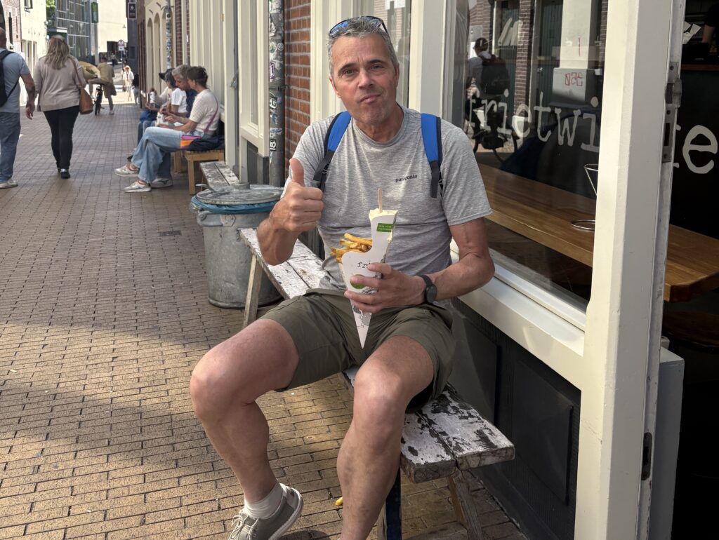 Aan het eind van de tocht meerden we aan in de stad, en liepen we even de drukke binnenstad in. Patat wilde ik. Dat vonden we bij de Frietwinkel in de Folkingestraat. Ik nam een grote, met mayo. Het was een heerlijk zakkie troost.