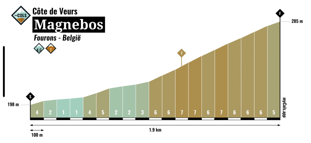 Vanuit Veurs kun je twee mooie beklimmingen doen om de dag te beginnen: noordwaarts die naar De Plank, en oostwaarts die naar en door het Magnebos. Lekkere opwarmers. De weg naar het Magnebos begint rustig vals plat, maar wordt steeds meer klimmen, tot in het bos zelfs even de 8% wordt aangetikt. Mooi asfalt, fraai bos, fijne klim.